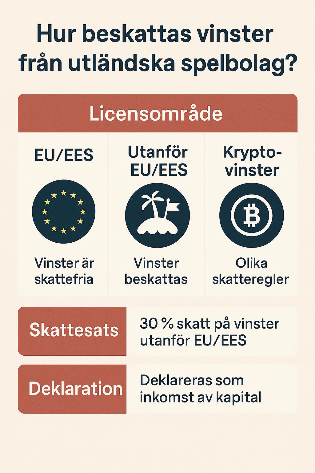 Vinster från spelbolag med EU-licens (exempelvis MGA) är skattefria i Sverige. Spelar du hos icke-EU-licensierade aktörer, som Curacao, måste vinster deklareras och beskattas. Läs alltid det finstilta och kontakta Skatteverket vid osäkerhet.